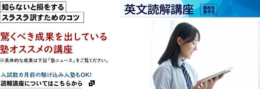 上がったと話してくれました。また、学校の授業での説明が少し理解できるようになった、とも話してくれました。Xさんは入塾時に「あまりにも英語ができなさすぎるので、できるだけはやく点を上げたい」ということで、「英文読解セミナー」を週2回来ていただくことにしました。最初はゼロからの出発でパニック状態でしたが、確かにこの頃は少しだけわかってきたようです。この調子なら来年の入試に間に合いそうです。