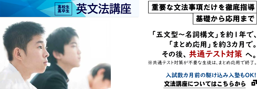 豊橋の高校生、高卒生対象の英語塾です。大学受験、共通テスト、国公立難関私大、地元中堅私大に対応。少人数。英作文添削指導、中学生クラスも。
